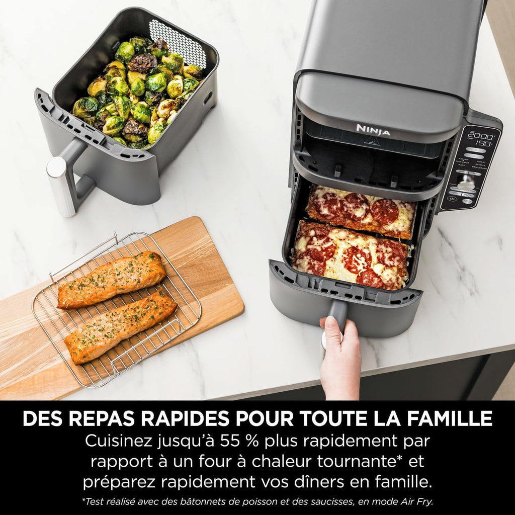 - INCLUT : Friteuse sans huile Ninja Double Stack 9.5L (prise UE), 2 tiroirs 4,75L, 2 plaques de cuisson, 2 grilles. Pièces résistantes au lave-vaisselle. Dimensions : H 38,5 cm x L 28 cm x P 47 cm. Poids : 10,3 kg. Couleur : gris